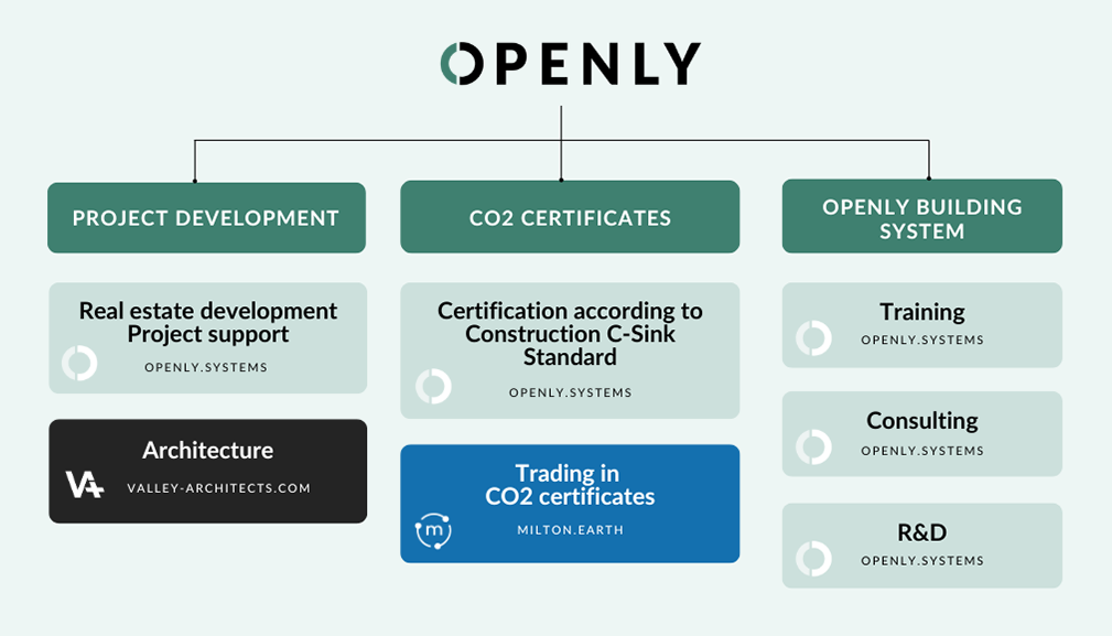 Openly Holding owns various patents, the milton.earth brand as a CO2 trader, Valley Architekten AG and a stake in Cancret AG. A further spin-off for the Openly Airbox and Openly OS is in preparation.